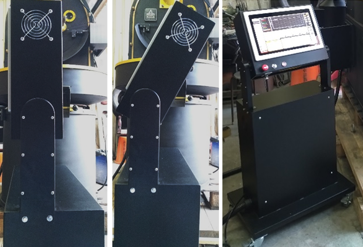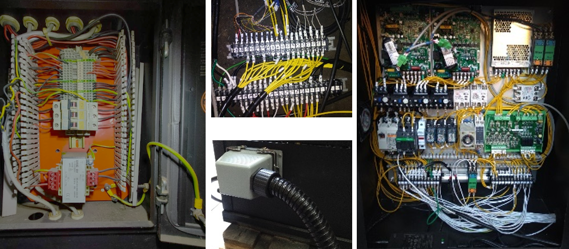 將機台端原有的配電系統移除,在機器端重新配置機電系統電路,並額外獨立出電控系統,可在獨立的電控箱做系統操作,控制面板可調整角度方便不同身高的人操作,且原系統中並無緊急開關以及蜂鳴器等安全裝置,在新系統中皆新增上去
